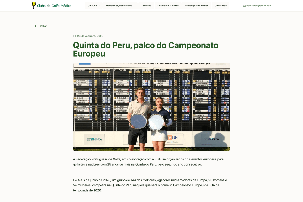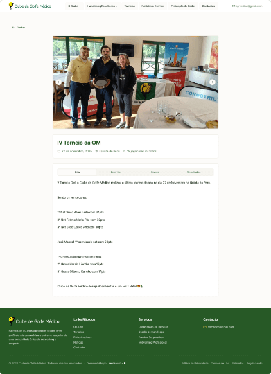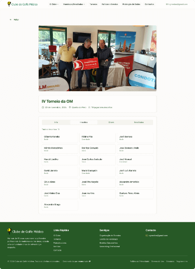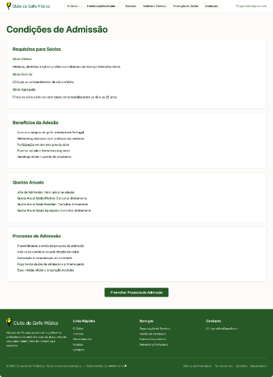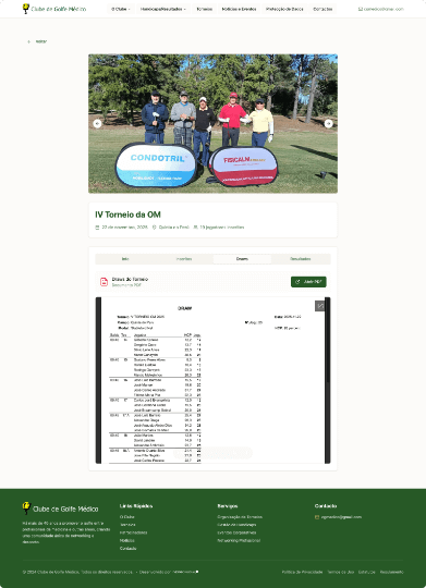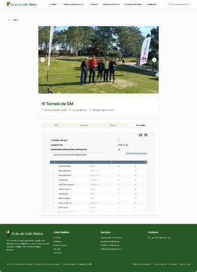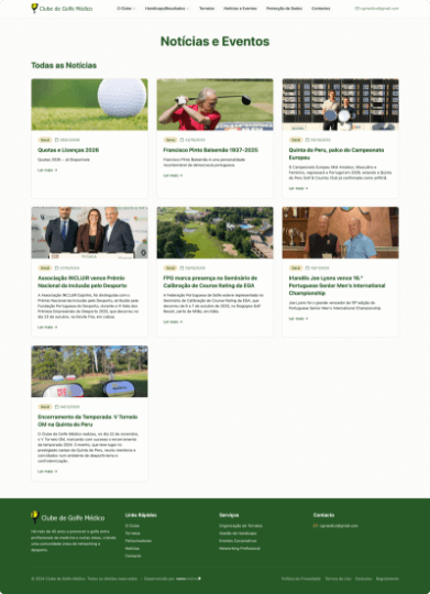 Criar o site do Clube de Golfe Médico foi um projeto inspirador que uniu tecnologia, elegância e tradição. Desde o início, o nosso objetivo foi traduzir a identidade do clube — marcada pela excelência e pelo espírito de comunidade — num ambiente digital moderno e intuitivo.